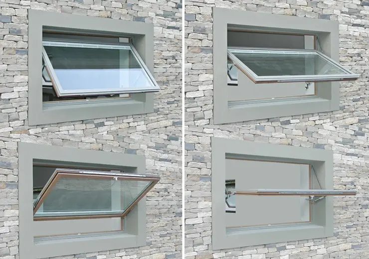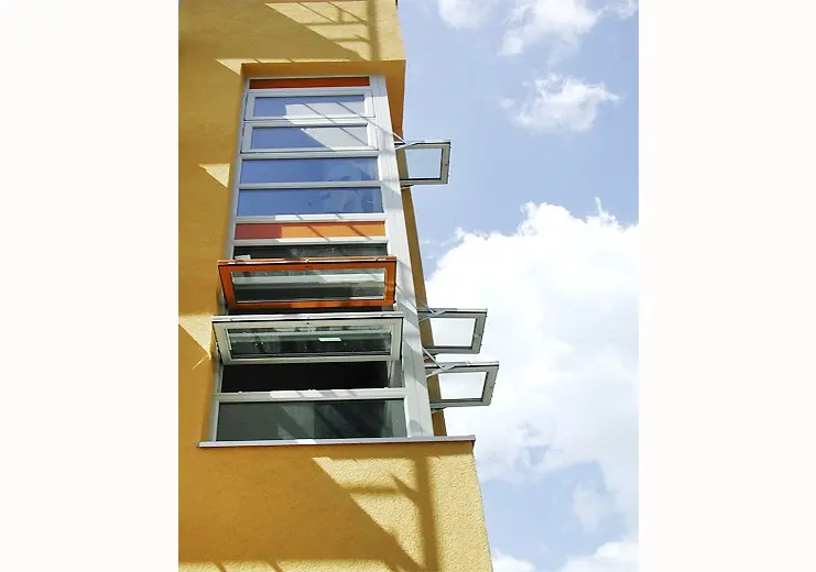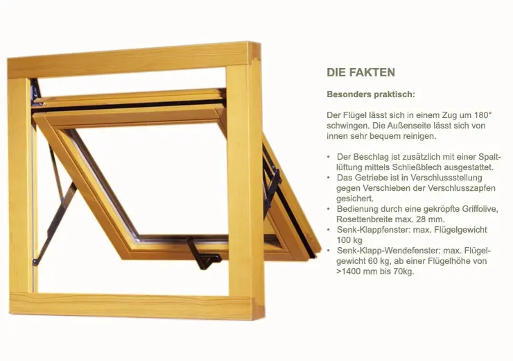 Je nach Fensterhöhe ist optional ein Wende-Beschlag erhältlich, welcher bis ca. 180° horizontal vor der Fassade schwenkbar ist.