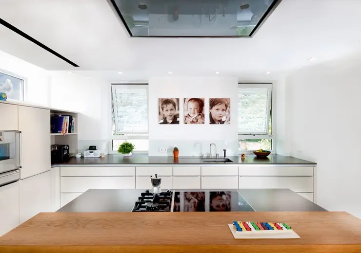 Die außen beidseitig vertikal im Fensterfalz gleitenden Teleskoparme aus Stahl im Silberlook laufen seitlich unterhalb der Flügel.